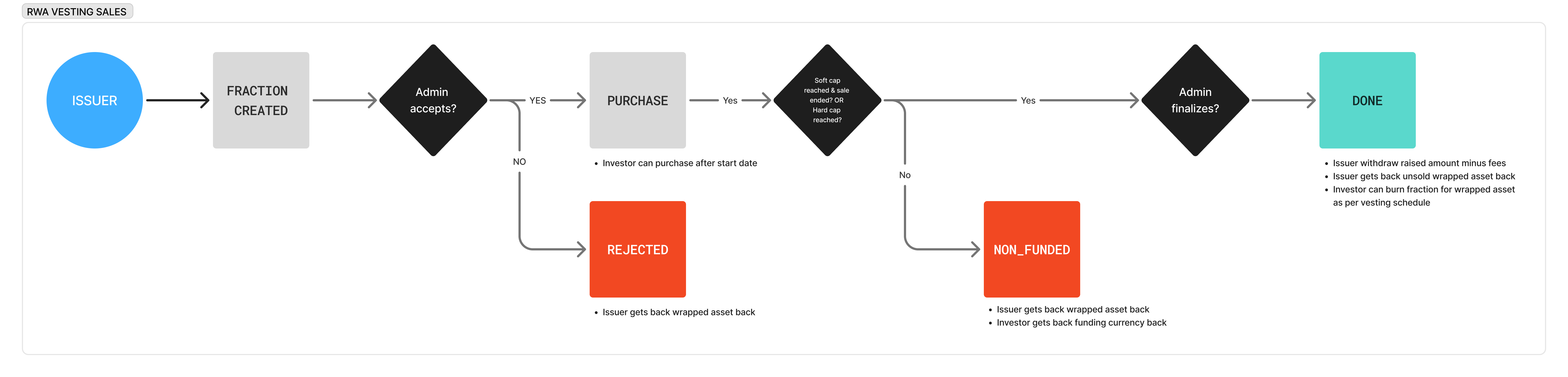 - The Fraction Market processes the request and creates a new Fraction Sale with the specified number of fractions to be sold to investors. During this process, the platform sets both the softcap and hardcap. If the softcap is not reached, users can claim their invested funds, and the Issuer can unwrap their collateral from the Vault.